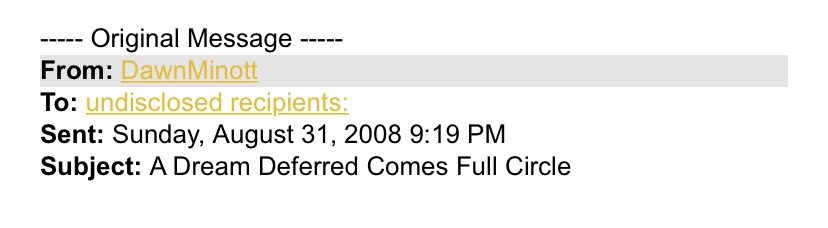 Beforeword: I was searching through email for something and came across this message. At the time, I had just moved to NY for work. On the day I wrote this email, I was sitting on the cusp of history being changed and didn’t know it …