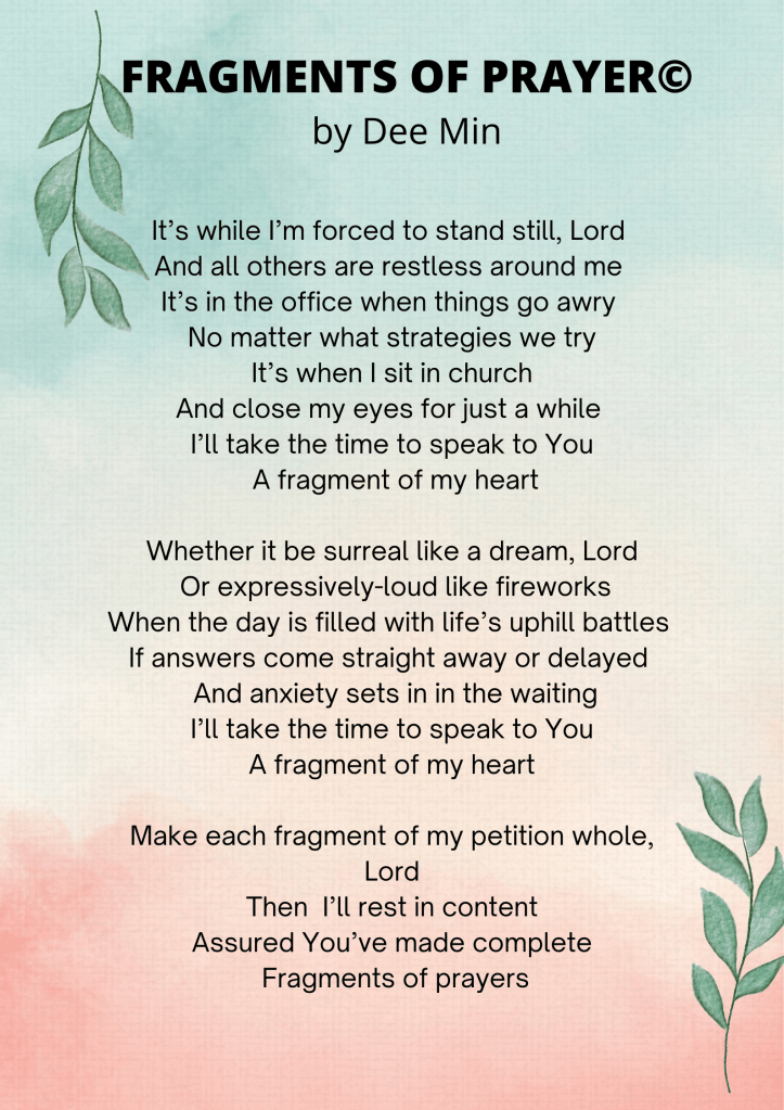 So prayers are fragments of what my heart feels in that moment and I share it with my God.