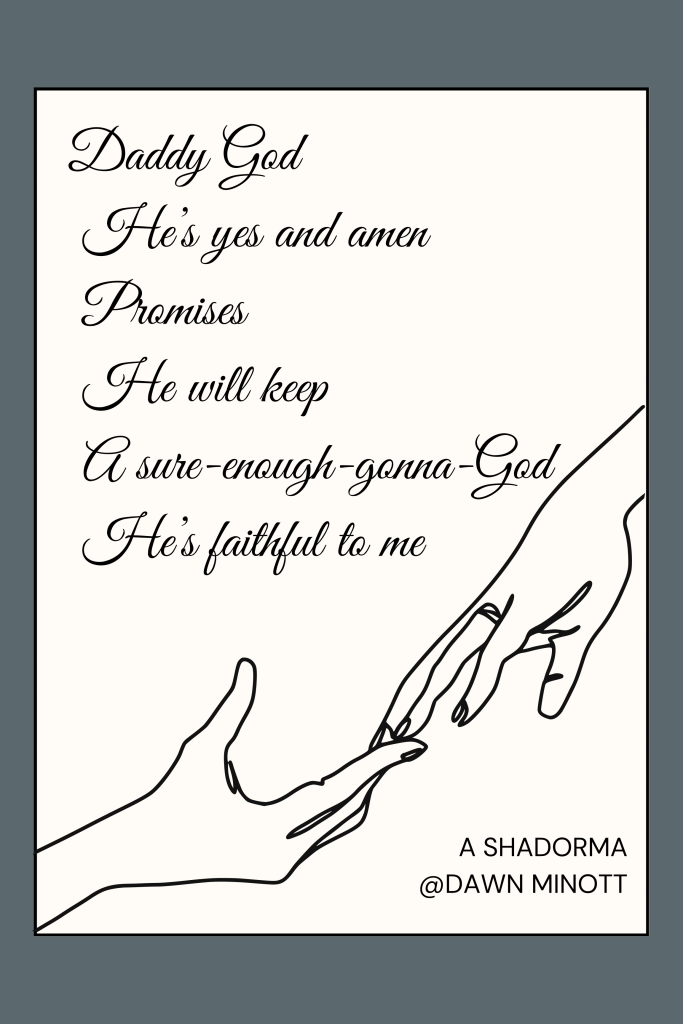 Afterword: this tribute piece to God concludes this week’s thematic focus on the poetic form—Shadorma!!!! Shadorma is a Spanish 6-line syllabic poem of 3/5/3/3/7/5 syllable lines respectively.