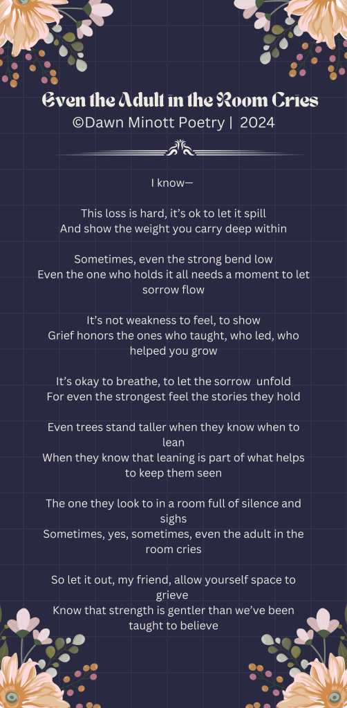 Beforeword: A colleague with whom my friend co-chaired an internship program for students for over 25 years suddenly passed away. Now, standing before her students, their sad eyes looking back at her, she finds herself comforting them, holding back her own tears because, as she told me, she needed to be the adult in the room. Unable to be there to console her in person, I wrote and read this poem for her, hoping it offers some comfort from afar.